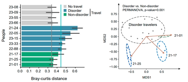 根据BC距离中位数,旅行者可进一步分为“紊乱组”和“非紊乱组”,后者微生物波动较小。为探究差异原因,研究团队分析了旅行距离、饮食、性别等因素,但未发现显著相关性。然而,通过NMDS分析发现,非紊乱组的初始微生物组成与紊乱组显著不同 (PERMANOVA,p = 0.001),提示初始菌群结构可能是关键影响因素。