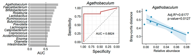 在非紊乱组中包括双歧杆菌等益生菌被发现在旅行前有所富集。为验证其预测潜力,团队结合外部宏基因组数据进行机器学习分析,结果显示多数富集微生物的AUC值>0.5,其中 Agathobaculum 属的预测效能最高 (AUC = 0.8824)。该属还与BC距离呈负相关,表明其可能通过稳定菌群抵御旅行干扰。