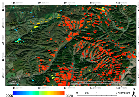 图1.2000年1月1日至2020年1月1日期间伊布里地区土地破坏情况的累积地图,颜色渐变代表破坏发生的时间。