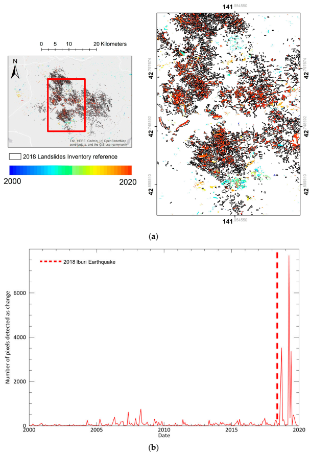 图2.图(a)展示了伊布里地区从2000年到2020年1月1日的土地破坏累积图,颜色渐变代表破坏发生的时间。图中叠加了描绘2018年发生的滑坡的参考清单所围成的多边形,为所展示的破坏情况提供了空间背景。图(b)展示了变化像素数量的时间序列;图表中的显著峰值反映了变化检测的增加,虚线对应于特定的破坏事件。变化像素的数量是根据图(a)左面板中整个区域的总面积计算得出的。