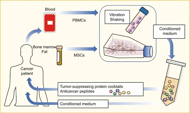 图2 振动处理后的肿瘤抑制细胞的应用及其条件培养基。作为癌症治疗的一种新选择,iTS细胞可从癌症患者血液中的外周血单核细胞(PBMC)以及患者骨髓或脂肪组织中的MSC中生成。通过振动将PBMC和MSC转化成iTS细胞后,它们的培养基(条件培养基)或肿瘤抑制蛋白及其活性片段(抗癌多肽)可用于癌症患者的施治。