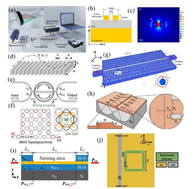 图2. 用于传感目的的不同WG配置:(a) 平面WG;(b) 槽位WG和e场分布 (c);(d) SWG WG;(e) 耦合的环形谐振器;(f) 基于SWG WG的传感的环形谐振器结构;(g) 光子晶体WG;(h) 悬浮膜WG;(i) 表面等离子体WG;(j) MIM WG。