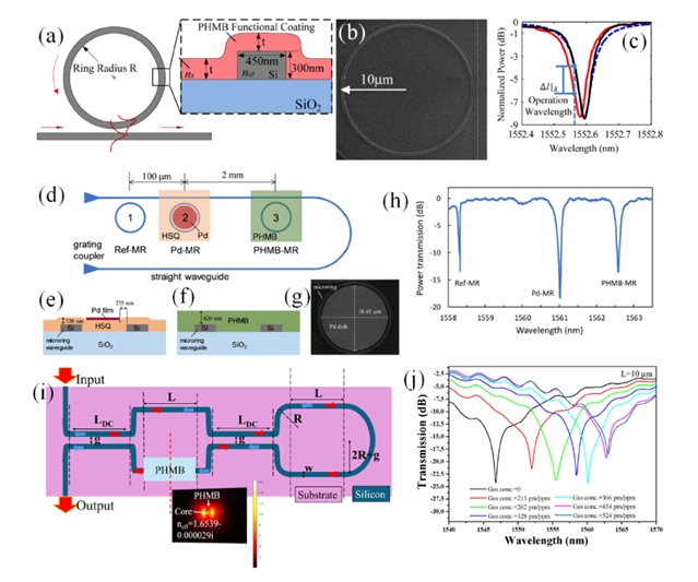 图3. (a) 具有PHMB功能层涂层的Si MRR CO2气体传感器示意图。该涂层位于MRR波导上。(b) Si MRR的扫描电子显微镜图像。(c) 功能化MRR的测量共振光谱。黑色曲线表示在纯N2气体中的初始光谱,而红色曲线则显示在0.5% CO2气体浓度下的光谱。蓝色虚线表示共振曲线拟合,用于将透射功率与相对波长偏移相关联。(d) 双气体传感器的示意图。由三个MRR组成的阵列:用于参考的Ref-MR、用于H2检测的Pd-MR和用于CO2检测的PHMB-MR。横截面图分别展示了 (e) Pd功能层和 (f) PHMB涂层。(g) Pd-MR的扫描电子显微镜图像。(h) 在N2气流条件下测量的双气体传感器的光谱响应。(i) LT-MZI结构。(j) 存在不同CO2浓度时LT-MZI结构的透射光谱。