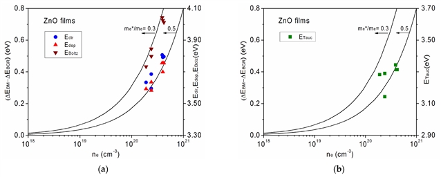 图10. 从不同的近似值获得的ZnO能隙随载流子浓度(ne)的变化:(a) Edir, Edop, EBoltz;(b) ETauc。实线表示两个不同有效质量值的预期变化(