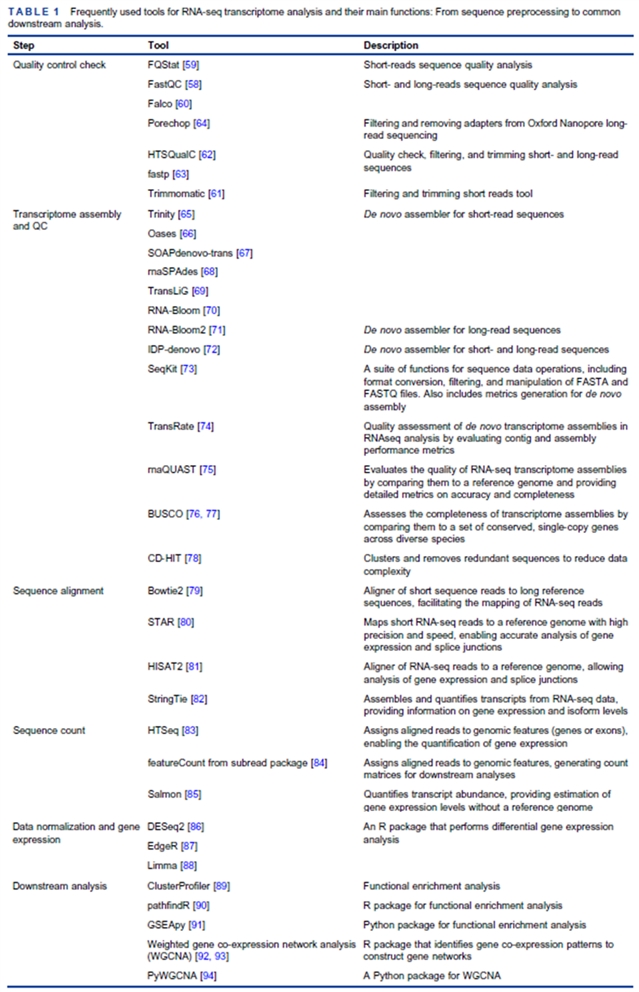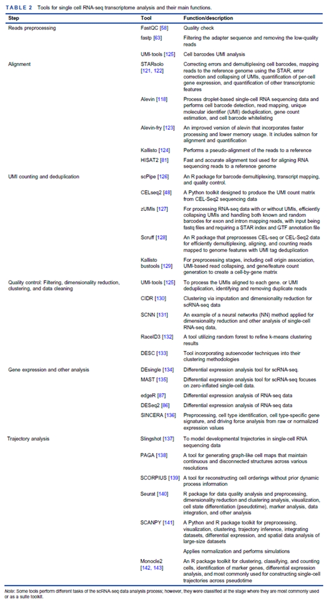 其次,作者系统整理了 bulk RNA-seq(Table 1)与scRNA-seq(Table 2)在质控、组装、比对、定量、归一化及下游分析环节的常用软件,并对其性能与适用场景进行了横向比较,可作为研究者选型速查表。