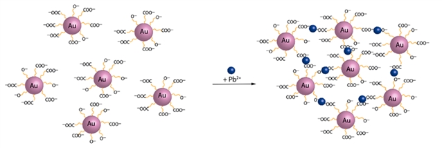 图3. AuNPs@OPE检测Pb2+的比色机制示意图。