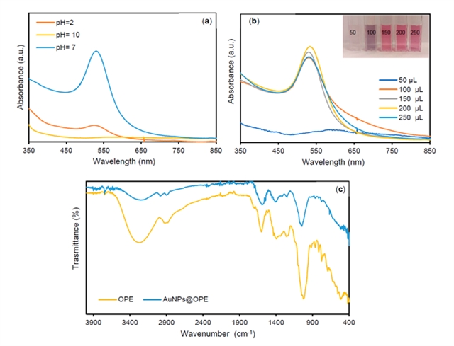 图1. (a) 在不同ph值下制备的AuNPs@OPE的紫外可见光谱,(b) 在不同数量的OPE (50-250µL) 下制备的AuNPs@OPE的紫外可见光谱,附图显示了制备的纳米颗粒的颜色变化,(c) OPE提取物 (黄色) 和冻干AgNPs@OPE纳米颗粒 (蓝色) 的FT-IR光谱。