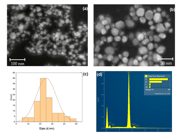 图2. (a,b) 不同放大倍数下的SEM图像,(c) 尺寸分布分析,(d) AuNPs@OPE的EDX光谱。