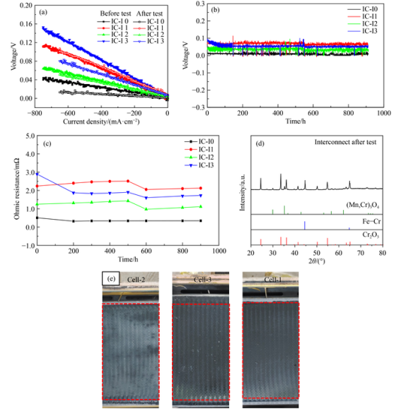 电化学阻抗谱分析表明,电解堆初始欧姆电阻为14.92 mΩ,测试后增至16.93 mΩ;极化电阻从25.16 mΩ升至42.25 mΩ后又降至34.49 mΩ。单电池中,Cell-2欧姆电阻增幅最大(63.3%),极化电阻增幅68.4%,与扫描电子显微镜观察到的Ni颗粒聚集、三相边界长度减少及孔隙率增加一致。界面方面,IC-I3(空气电极侧)电阻下降最显著(从2.89 mΩ降至1.73 mΩ),X射线衍射显示互连件表面生成Cr2O3与(Mn,Cr)3O4氧化物层,改善了界面接触。
