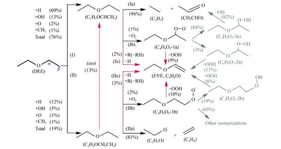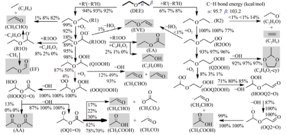 DEE的基础燃烧研究聚焦于层流燃烧速度、物种生成规律及反应路径。有实验表明,DEE的层流燃烧速度随初始温度升高而增加,随压力升高而降低,且在NH3火焰中添加DEE可提升火焰反应性并缩短点火延迟时间(IDT)。物种分析显示,DEE的热解初始产物为乙醛(CH3CHO)、乙烷(C2H6)、乙醇(C2H5OH)和乙烯(C2H4),主要通过C-O键断裂和氢提取反应分解。此外,DEE与正丁烷或异辛烷混合时,因释放C1-C2烃类物质,可有效抑制碳烟前体(如多环芳烃)的生成。