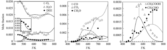 图5 10 bar压力下喷射搅拌反应器(JSR)中5000 ppm DEE的氧化(实验结果(符号)与计算结果(线)对比)