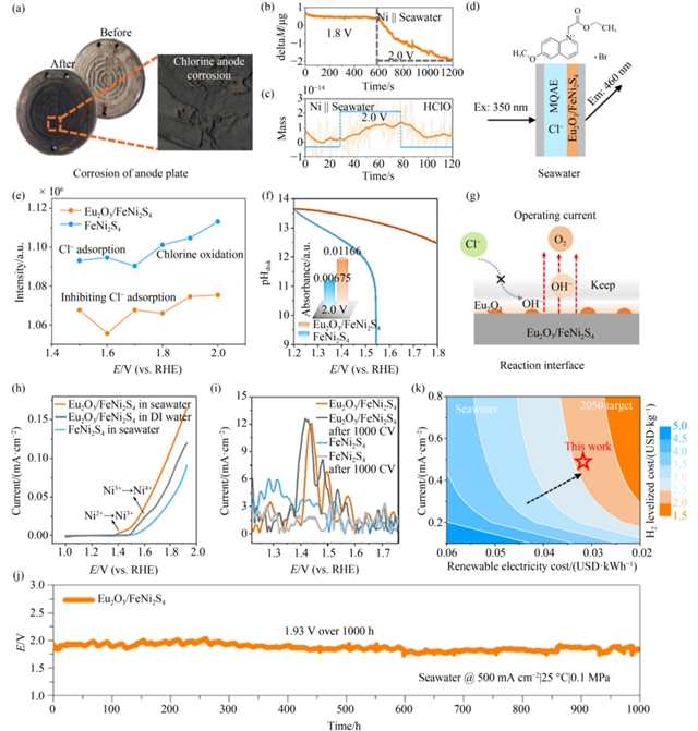 本文基于《美国化学会杂志》上发表的论文——《千瓦级碱性海水电解槽的稀土防腐》,对稀土金属保护层创新防腐策略进行了解读。该研究通过在过渡金属电极表面构建富氧亲和性的Eu2O3层,创造局部富OH-微环境以抑制Cl-吸附与氧化,显著延长了电极寿命。研究团队首先采用电化学石英晶体微天平(EQCM)和差分电化学质谱(DEMS)对传统Ni网阳极的实时腐蚀行为进行分析,发现氧化产物HClO是导致阳极金属腐蚀的关键因素,而电解液中OH-、SO42-等阴离子的竞争吸附可抑制Cl-在界面的累积。基于此,他们通过电沉积法在FeNi2S4层引入稀土元素Eu,经氩气保护煅烧制备出Eu2O3/FeNi2S4复合电极,利用稀土与过渡金属的氧亲和性差异调控界面化学环境。