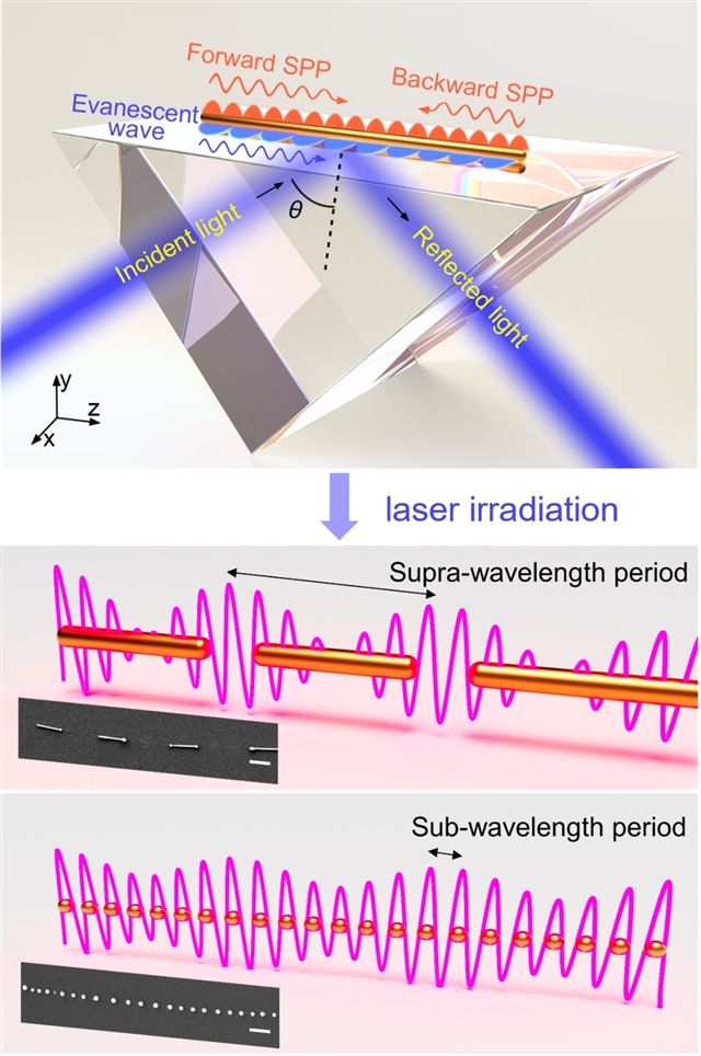 该研究团队提出了一种基于光驱动自组装的高效加工金属纳米结构阵列的方法。如图1所示,该方法采用激光斜入射方式激发金属纳米线的表面等离激元(SPP)模式,通过SPP与界面上倏逝波的干涉叠加产生驻波及光学拍频效应,形成空间上强度周期分布的光场,在金属光热效应作用下,诱导产生周期性分布的温度场,最终生成一维周期性排列的纳米颗粒阵列。所制备的阵列展现出高度有序且高质量的单元结构,其最小周期突破衍射极限,达到了亚波长尺度。