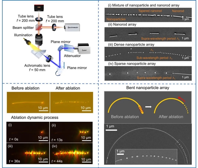 该方法在宽束斑的脉冲激光单光束、单次曝光下,将单根金属纳米线烧蚀成一维周期性排列的金属纳米颗粒阵列(图2),具有简单、高效、低成本等优势。同时,通过调整纳米线长度以及入射光的角度等,可调控阵列结构参数,实现周期在亚波长至超波长范围内可调,制备得到的纳米颗粒形貌良好,尺寸较为均一,表面光滑,光学损耗较低。该方法还具备灵活的排列方向调控能力,通过调节纳米线的排布方向,可获得相应取向的纳米颗粒阵列。