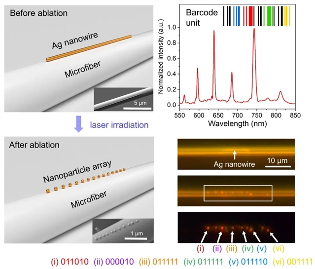 此外,这种光驱动自组装的方法可以拓展到弯曲衬底(如微纳光纤)上,并在弯曲的表面制备一维等离激元阵列,如图3所示。阵列中每个纳米颗粒与微光纤的回音壁模式耦合,形成高Q值的光子–表面等离激元复合微腔,并呈现独特的散射光谱特征,可视为一段条形码。通过多个颗粒的组合,可扩展为几十位条形码,显著提升编码容量,从而实现高密度信息编码应用。