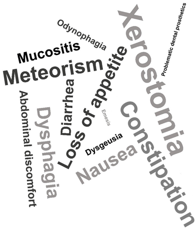 症状负担分析显示,口干178例(59.33%)、食欲减退122例(40.67%)、味觉障碍93例(31%)最为常见。口干与营养不良风险显著相关(p=0.008),味觉障碍呈趋势相关(p=0.100)。血液系统与实性肿瘤患者症状模式不同:实性肿瘤患者更常出现吞咽困难、疼痛性吞咽及便秘;血液系统患者腹泻及恶心更常见。放疗与吞咽困难及疼痛性吞咽显著相关。不同年龄组中,≥75岁患者口干、吞咽困难及便秘更常见,而<75岁患者味觉障碍及腹泻更为突出。