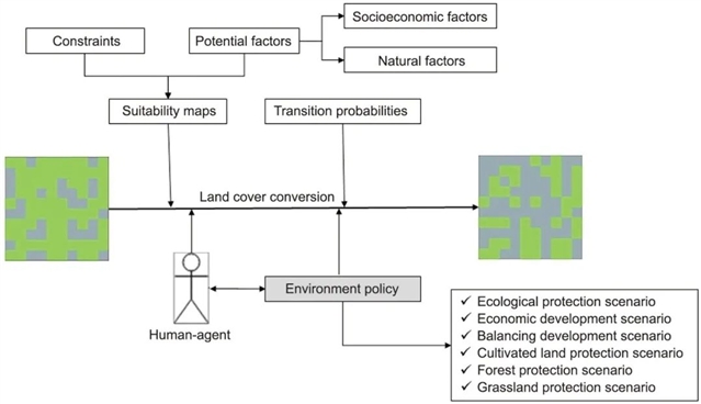 研究的核心在于将元胞自动机的空间自组织能力和多智能体模型的涌现性相结合,探索人类与环境之间的双向交互作用。该模型包括初始化模块、迁移模块、资产模块、土地适宜性模块和土地利用变化决策模块。通过空间逻辑回归模型,研究人员获得了影响城市用地的社会经济因素转换概率;同时,利用多准则评价和马尔可夫模型,获得了影响生态用地的自然属性因素转换概率。