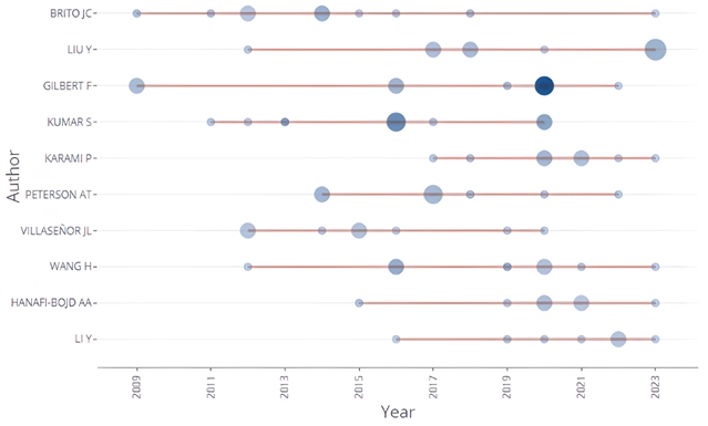 关键作者的时间趋势可视化:使用蓝色圆圈表示每位作者发表论文的数量,红色折线显示各作者随时间发表论文的变化趋势