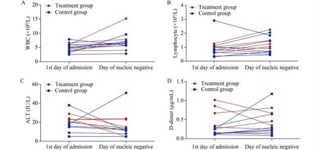 图2 所有患者入院第1天与PCR检测结果转阴当天的实验室指标动态变化