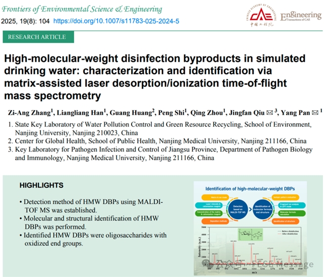 本文内容来自FESE期刊2025年第19卷第8期发表的研究论文“High-molecular-weight disinfection byproducts in simulated drinking water: characterization and identification via matrix-assisted laser desorption/ionization time-of-flight mass spectrometry”。通讯作者为南京大学环境学院潘旸副教授和南京医科大学邱静凡。