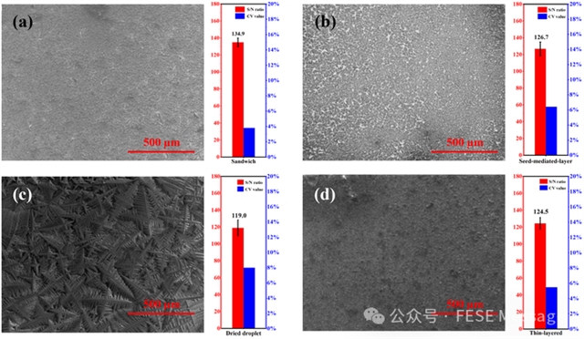 本研究针对HMW DBPs的检测需求,系统优化了基质辅助激光解吸电离飞行时间质谱(MALDI-TOF MS)的实验条件。通过对比反射/线性正负离子模式下的检测效果,发现反射正离子模式可显著提升信号强度;进一步筛选超-2,5-二羟基苯甲酸(super-DHB)、CHCA等6种基质后,确定super-DHB在正离子模式下电离效率最高且变异系数最低。在激光强度优化中,90%激光能量下信噪比达到峰值,而过高能量会导致样品燃烧。阳离子化试剂筛选显示,2 mg/mL三氟乙酸钠(NaTFA)可促进目标物形成[M + Na]+离子,峰强度显著高于硝酸银与氯化钾。沉积方法对比中,三明治法则通过两层基质包裹样品,获得了直径小于50 μm的均匀晶体,信噪比达134.9且变异系数仅3.8%,优于干燥液滴法等其他三种方法(图1)。