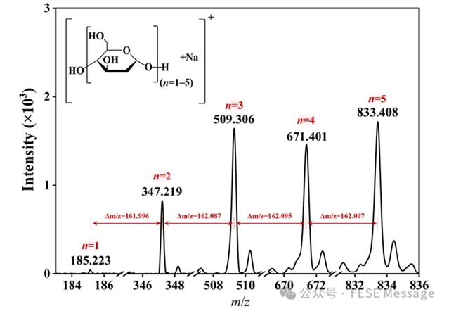 基于优化条件(20 mg/mL super-DHB基质、2 mg/mL NaTFA、反射正离子模式、激光强度90%、三明治沉积法),团队在模拟饮用水中检测到了5组间隔162 Da(淀粉单体分子量)的特征峰(图2)。同位素模式分析显示,这些物质不含卤素原子;结合激光诱导解离(LIFT)模式串联质谱,观察到质荷比(m/z) 为185、347、509等系列寡糖碎片离子,提示其为淀粉氧化降解产物(图3)。进一步通过数据库对比与元素组成分析,最终确定这些HMW DBPs的分子组成为C30H51O27Na、C36H61O32Na等,均为末端羧基化的聚葡萄糖醛酸钠盐。结构解析表明,这些产物源于淀粉在氯化消毒过程中的选择性氧化——葡萄糖残基的C6位羟基转化为羧基,同时糖苷键断裂形成低聚糖链。