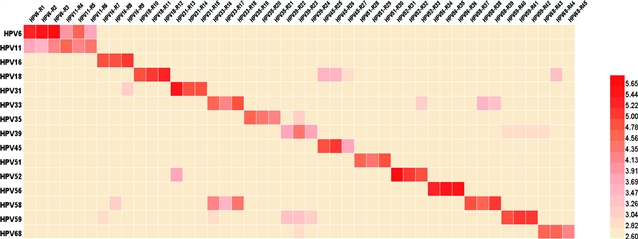 本研究利用HPV6、11、16、18、31、33、35、39、45、51、52、56、58、59、68型共15个型别的假病毒与各型单价疫苗的兔抗血清的交叉中和结果(图1),筛选出交叉中和作用小且无相互干扰的型别。确定了五种用于联合检测的假病毒组合,HPV6-33-45、HPV31-11-58、HPV16-18-68、HPV39-51-35、HPV59-56-52,每组分别按顺序标记为绿色、红色和深红色荧光蛋白。通过比较多型联合检测假病毒组合与单型假病毒检测同一血清样本的结果,发现无明显差异,证明该假病毒组合可应用于联合检测。