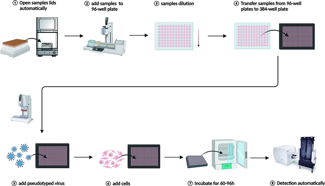 为了初步建立高通量检测方法,研究人员引入自动化检测仪器和384孔微孔板。针对不同参数的靶细胞加入量、病毒-血清孵育时间和检测时间,测定了十五价疫苗接种后血清样本的中和抗体滴度值。比较结果后,最终选择每孔3X103个293FT的细胞加入量,无需病毒-血清预孵育,以及培养时间(60 h-96 h)作为最佳参数(图2)。根据上述参数,初步建立了高通量检测方法(图3)。