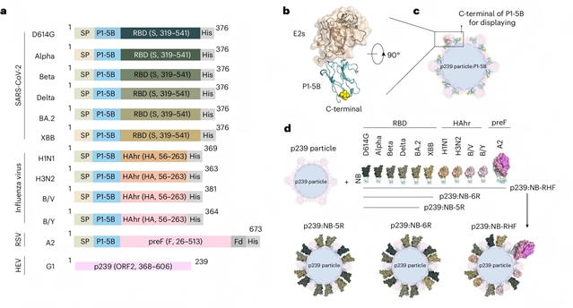 首先,研究人员利用戊肝疫苗免疫羊驼,并通过噬菌体展示技术筛选出戊肝特异性纳米抗体P1-5B。纳米抗体-戊肝E2s蛋白复合物的共晶结构显示,P1-5B高亲和力结合于p239颗粒表面凹陷处,而其C末端朝向颗粒外部,为多抗原展示提供了可扩展“接口”。接下来,研究团队构建并测试了最多展示11种抗原的“四合一”联合疫苗—p239:NB-RHF(图),包括6种新冠病毒突变体抗原、4种流感病毒亚型抗原和1种呼吸道合胞病毒三聚体抗原。