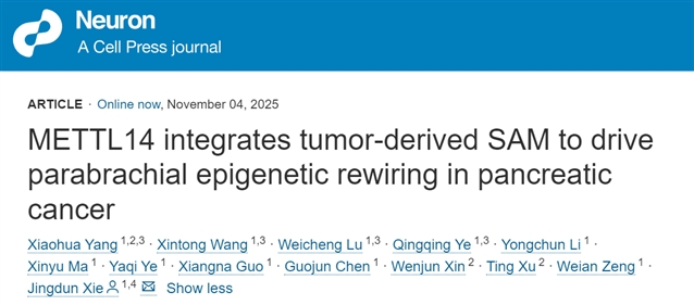 2025年11月4日,中山大学肿瘤防治中心麻醉科谢敬敦教授团队在《神经元》(Neuron)上发表题为 “METTL14 integrates tumor-derived SAM to drive parabrachial epigenetic rewiring in pancreatic cancer” 的研究论文。