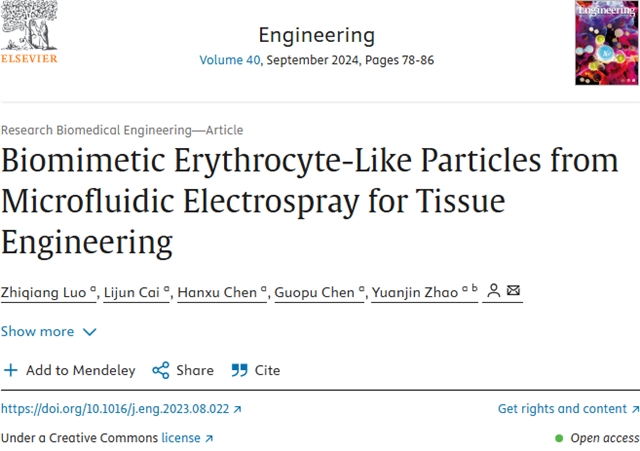 在再生医学领域,微球因其独特的物理和化学特性,已成为组织工程和药物递送的重要工具。东南大学团队在中国工程院院刊《Engineering》上发表了一篇题为“Biomimetic Erythrocyte-Like Particles from Microfluidic Electrospray for Tissue Engineering”(微流控电喷雾仿生类红细胞微球用于组织工程)的研究论文,介绍了一种新型的仿生类红细胞微球(ELMPs),该微球通过微流控电喷雾技术制备,具有氧气递送和近红外响应性释放生长因子(GFs)的能力,展现出在组织工程中的巨大潜力。