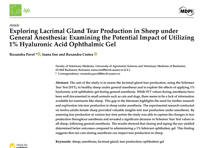 文章概述:本研究利用泪液分泌试验(Schirmer Tear Test,STT)评估了健康绵羊在全身麻醉下的泪腺泪液分泌情况,并探讨了在全身麻醉期间使用1%透明质酸眼用凝胶的效果。研究发现,与使用1%透明质酸眼用凝胶相比,眼睛闭合并用胶带固定眼睑可获得更佳的效果。这一结果表明,眼部护理可以对麻醉期间的绵羊泪液分泌产生影响。