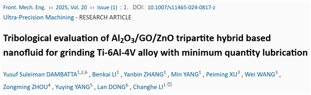 论文标题:Tribological evaluation of Al2O3/GO/ZnO tripartite hybrid based nanofluid for grinding Ti-6Al-4V alloy with minimum quantity lubrication