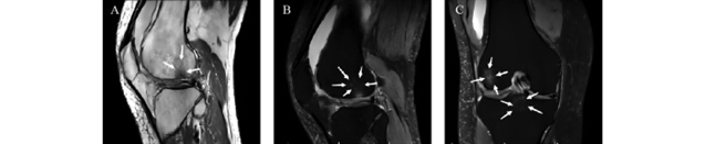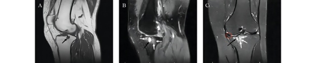 图2 62岁女性膝关节骨关节炎的磁共振成像。(A)矢状位T1加权像显示股骨远端弥漫性骨髓水肿,呈低信号(白色箭头)。(B)矢状位T2加权中间加权脂肪抑制像显示股骨远端同一病灶(白色箭头)。(C)冠状位脂肪抑制质子密度(PD)MRI显示股骨内侧髁负重区及胫骨前交叉韧带止点下方骨髓水肿(白色箭头)