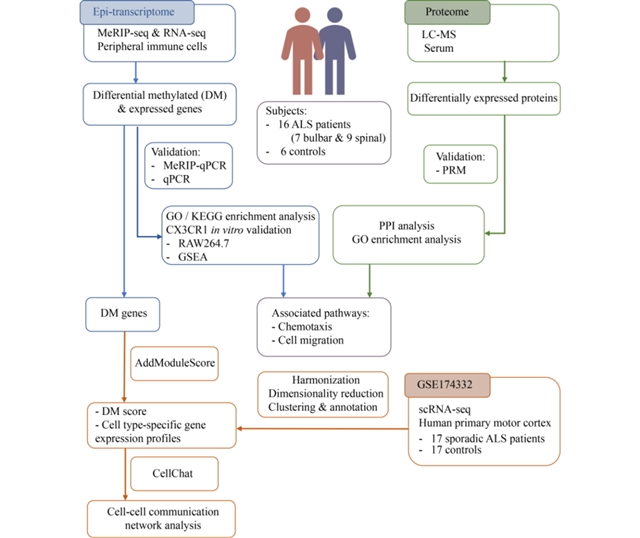 中国医学科学院北京协和医学院崔丽英、北京协和医学院基础学院张学等系统探讨了外周免疫细胞中N6-甲基腺苷修饰异常在肌萎缩侧索硬化症发病中的作用。研究整合了表观转录组学、蛋白质组学和单细胞转录组学分析,结合细胞实验验证,揭示了N6-甲基腺苷修饰通过调控免疫细胞迁移影响肌萎缩侧索硬化症进展的新机制(图1)。