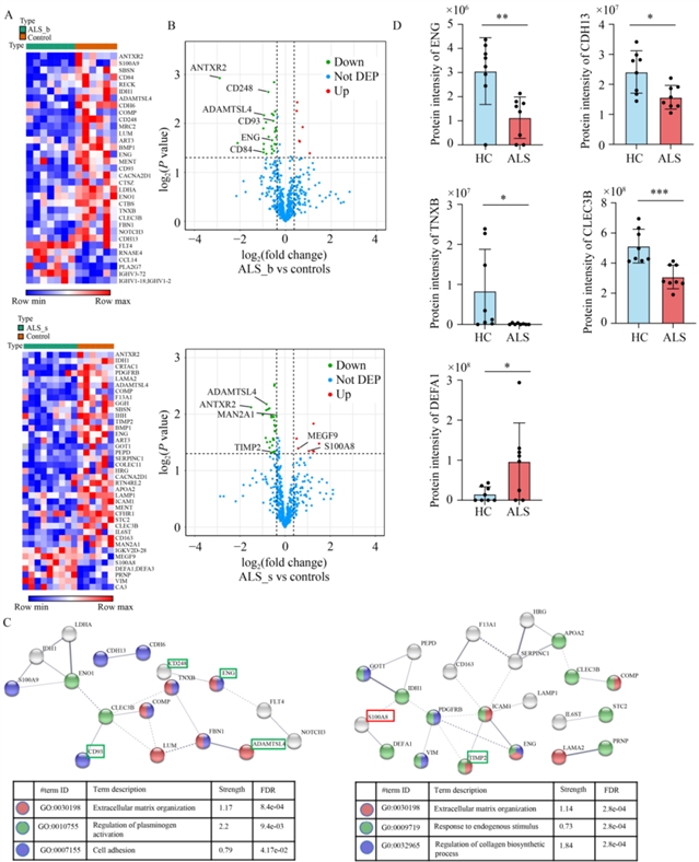 图5 肌萎缩侧索硬化症患者的血清蛋白质组变化及相关生物学通路