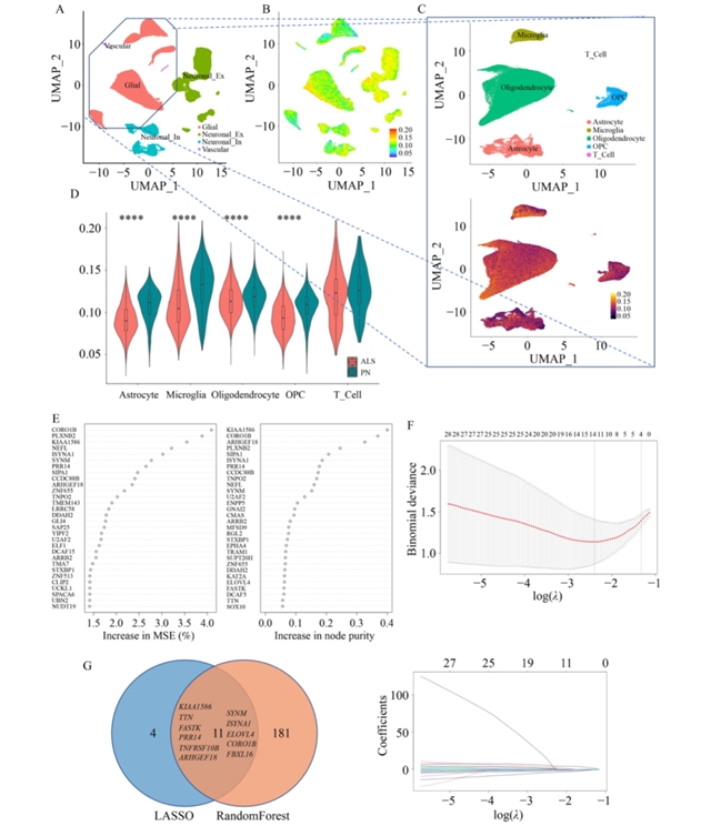 为探究外周差异甲基化基因对中枢神经系统的影响,研究分析了运动皮层的单细胞转录组数据,发现这些基因在中枢神经系统中呈现细胞特异性表达变化,尤其是小胶质细胞。通过计算差异甲基化基因的平均表达水平(DM_score),研究观察到肌萎缩侧索硬化症患者细胞的DM_score显著降低,其中小胶质细胞的DM_score异质性最高(图6)。随机森林和LASSO回归分析进一步筛选出11个可能参与肌萎缩侧索硬化症发病的核心基因,包括调控细胞迁移和免疫浸润的CORO1B、ARHGEF18等。