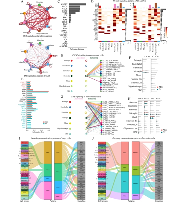 细胞通讯分析显示,肌萎缩侧索硬化症患者神经元与非神经元细胞间的全局通讯数量总体增加,但抑制性神经元与少突胶质细胞、兴奋性神经元的通讯强度降低(图7)。信息流向分析发现,CX3C、TGFb等通路的信息流量在患者中显著减少,而ANGPT、VEGF通路增加。进一步研究发现,兴奋性神经元是CX3C配体的主要来源,而肌萎缩侧索硬化症患者中抑制性篮状细胞对小胶质细胞的CX3C信号贡献消失,同时小胶质细胞与抑制性神经元间的GAS6-AXL信号也显著降低。这些结果提示,外周免疫细胞的N6-甲基腺苷修饰异常可能通过影响免疫细胞迁移,间接改变中枢神经系统的细胞通讯网络,参与神经炎症过程。