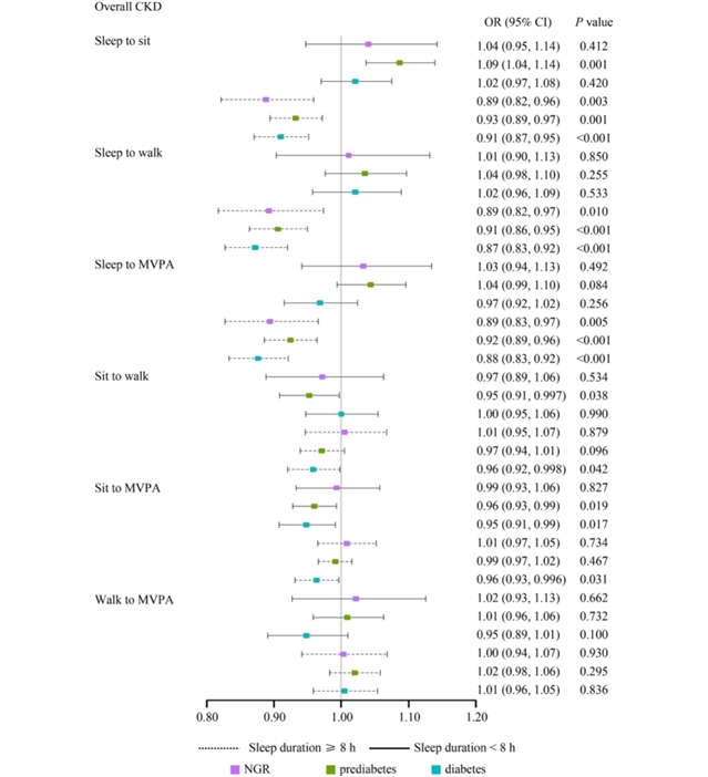图3 在不同血糖状态(包括正常血糖调节、糖尿病前期及糖尿病)参与者中,按睡眠时间分层时,重新分配1小时睡眠、久坐、步行及中高强度体力活动与总体慢性肾脏病患病率的关联