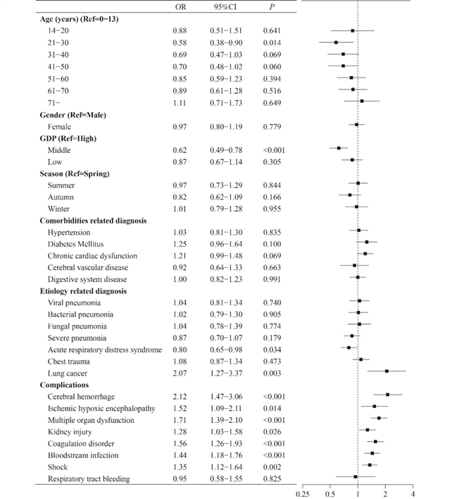 图2 与静脉-静脉体外膜肺氧合支持患者住院死亡率显著相关的患者相关因素