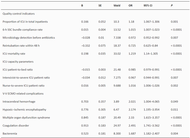 表1 高容量中心静脉-静脉体外膜肺氧合支持患者的质量指标与住院死亡率关联的多因素分析
