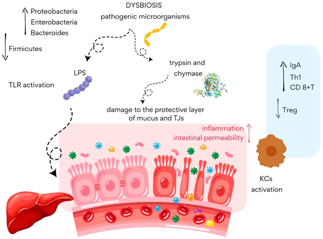 图片:MASLD中肠道屏障的破坏。LPS—脂多糖;TJs—紧密连接蛋白;KCs—枯否细胞;IgA—免疫球蛋白A。