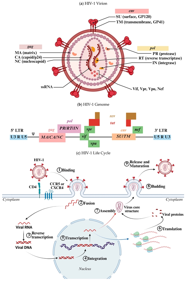 图片: (a) HIV-1病毒颗粒示意图。HIV-1是一种包膜病毒,含有两条负链单链RNA (−ssRNA)。(b) HIV-1基因组示意图。图中展示了病毒ssRNA中各基因的组织结构,其中若干基因通过可变剪接机制表达。(c) HIV-1生命周期示意图。