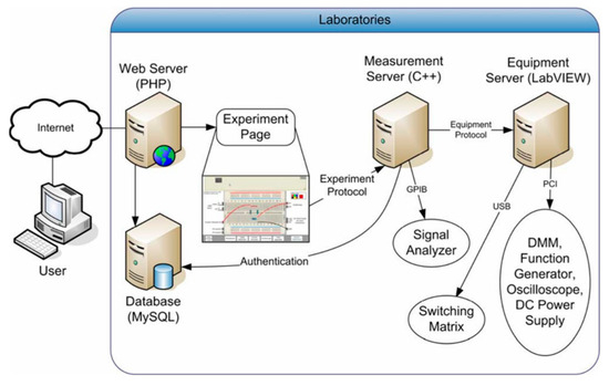 VISIR远程实验室以“复刻传统实验体验”为核心设计理念,其技术架构分为硬件与软件两大部分。硬件层面,核心由 instrumentation 平台与专有交换矩阵(SM)构成:前者基于PCI扩展仪器(PXI)底盘,集成直流电源、数字万用表、函数发生器与示波器等模块,实现电路测量功能;后者为PCI/104规格的印刷电路板堆叠结构,含17个节点(仅10个可用于组件互联),通过继电器替代物理接线,完成电路远程搭建。软件层面,系统采用GNU GPL协议开源发布(SM控制器固件除外),Equipment Server依赖台LabVIEW(实验室虚拟仪器工程工作台)实现硬件交互,用户界面(UI)基于HTML5开发,支持多设备访问,同时集成OpenLabs作为远程实验室管理系统,可实现用户调度与数据采集。近年来,VISIR也进行了局部升级,如与WebLab-Deusto(开源远程实验室管理系统)集成以优化用户管理。