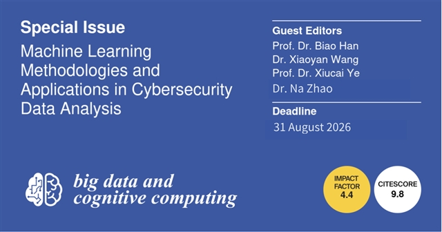 Big Data and Cognitive Computing (BDCC) 邀请了国防科技大学的韩彪研究员,茨城大学的王潇岩教授,筑波大学的叶秀彩副教授和国防科技大学的赵娜博士,合作建设特刊Machine Learning Methodologies and Applications in Cybersecurity Data Analysis (机器学习方法论及其在网络安全数据分析中的应用)。本特刊欢迎在机器学习方法论及应用方面、并专门针对网络安全数据分析挑战的最新研究成果。其征稿范围包括但不限于以下主题:
