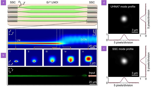 图1 (a)集成模斑转换器的掺铒波导放大器芯片示意图;(b)上图:模斑转换器区域沿传播方向的截面光场分布;插图(i-v)展示了不同位置(虚线处)的横截面模场仿真结果;下图:从模斑转换器右侧输入激光时观察到的上转换荧光图像;(c)模斑转换器的截面模场测试结果;(d)超高数值孔径光纤的截面模场测试结果