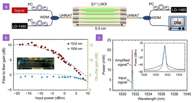研究人员将高耦合效率的模斑转换器与掺铒波导放大器单片集成,通过对5.5 cm长的掺铒铌酸锂波导双向泵浦,在1532 nm波长附近实现了>10 dB的片下净增益(对应>15 dB片上净增益),噪声系数低至6.8 dB,在输出光纤中测量到的最高放大功率超过20 mW(对应光纤输入功率~10 mW),如图2所示。