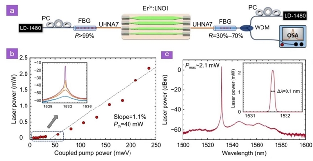 研究人员进一步展示了该集成波导放大器芯片作为高效增益芯片的重要应用,通过外接光纤布拉格光栅作为反射镜,成功构建法布里-珀罗型外腔激光器,在双向泵浦光激发下实现了最大光纤输出功率2.1 mW的窄线宽连续波激光,如图3所示。