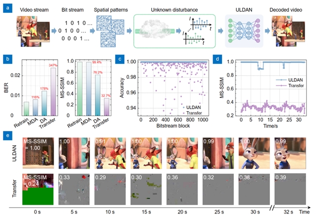 近年来,深度学习技术的引入为复杂信道下的高质量单像素图像传输提供了新的思路,使得在多种复杂场景中实现可靠的信息传输成为可能。然而,现有的单像素成像技术大多聚焦于特定场景下的信道条件,当面临未知的动态变化信道环境(如信号衰减不同、光照条件变化等)时,源域中预训练的深度学习模型往往在目标域中表现不佳。为了解决这一问题,研究团队将单像素成像任务中的图像重建过程分解为编码器和解码器两个阶段,并借助对抗学习的思想,将不同信道条件下的单像素探测信号映射到同一特征空间,从而实现不同数据分布之间的特征对齐。这一方法使得源域中的解码器模块可以在目标域中复用,进而实现目标域中图像的无监督高质量重建。