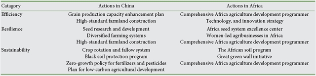 一是提高效率。中国通过《粮食产能提升规划 (2024–2030) 》提升粮食产量,推进高标准农田建设,2022年已建成6670万公顷,目标2030年新增8000万公顷。非洲通过《2063议程》《非洲农业综合发展计划》(CAADP),要求各国至少将10%预算投入农业,目标年增长率6%,并依托科技战略推动农业等领域发展 (表1)。